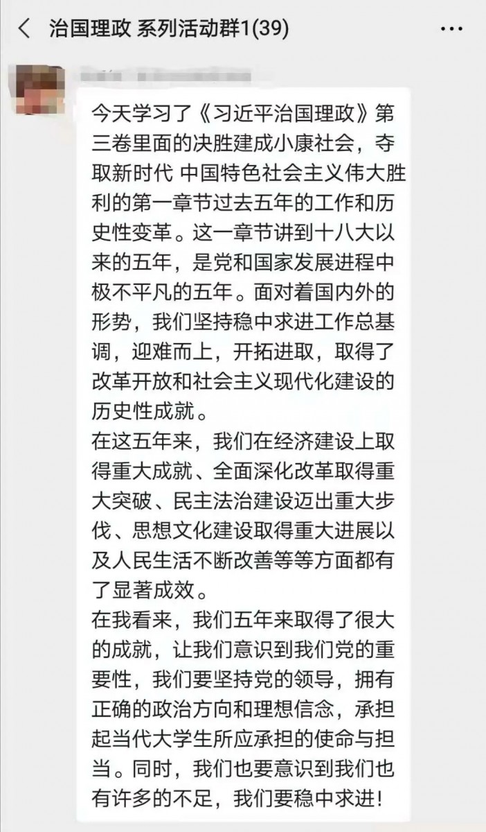 为促进我院更好地落实学习型党支部建设,学习新思想,提高支部成员的党性修养,深入学习贯彻《习近平谈治国理政》(第三卷),推动广大党员学懂弄通做实习近平新时代中国特色社会主义思想。人文学院学生党支部于2020年11月2日—9日在线上开展了第一周的《习近平谈治国理政》第三卷主题学习活动。本次学习活动旨在提高党支部成员们的自主学习能力,促进彼此思想交流与进步,深刻领会习近平总书记关于建设新时代中国特色社会主义的一系列重要讲话精神,加强理论学习。