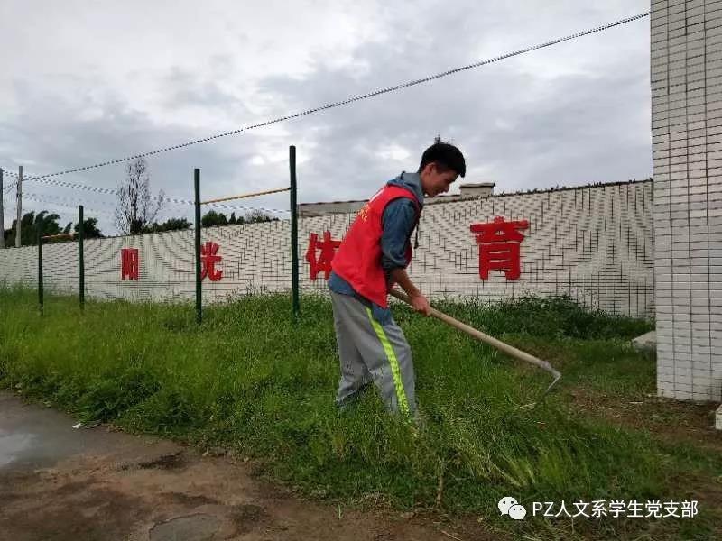 清晨,为了给师生们提供更便捷的环境,彭老师带领着志愿者们拔草。在教学楼与卫生间之间开辟了一条小径。
