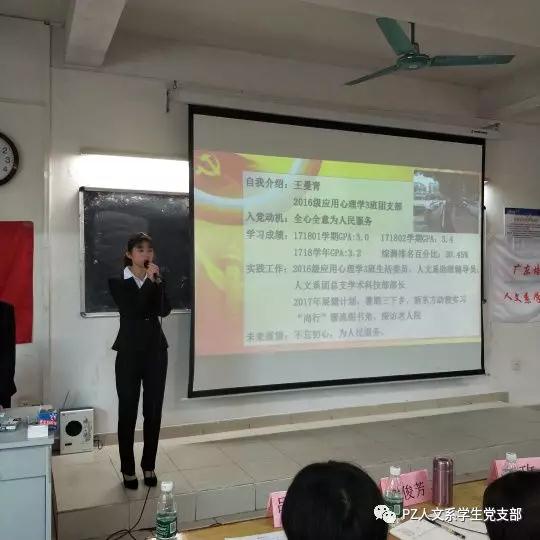 陈丽婷、李思慧等17位入党发展对象向党组织汇报自己在学习、生活、思想和工作上的进步已经存在的不足,并接受在场培养人与与会人员的评价与意见,最后由正式党员进行不记名投票表决。